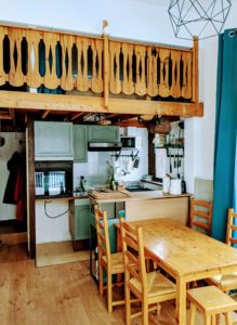 Le studio dispose d’une très grande terrasse au sud (40m2) et se compose d’un espace de vie (cuisine/salle à manger/salon) tout équipé, d’une salle de bain ainsi que de deux mezzannines (non carrez). Cinq couchages adultes sont possibles (lit double et simple dans les mezzanines et lit double dans le canapé convertible du salon). Un local à ski est accessible sur la terrasse.